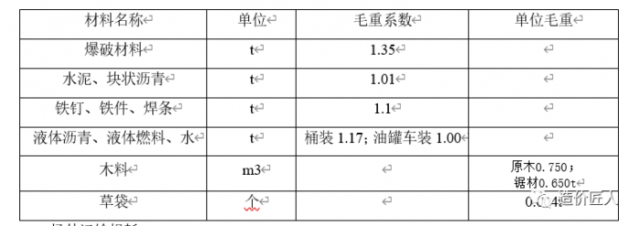 有容器或包裝的材料及長(zhǎng)大輕浮材料,應(yīng)按規(guī)定的毛重計(jì)算。桶裝瀝青、汽油、柴油按每噸攤銷一個(gè)舊汽油桶計(jì)算包裝費(fèi)(不計(jì)回收)。